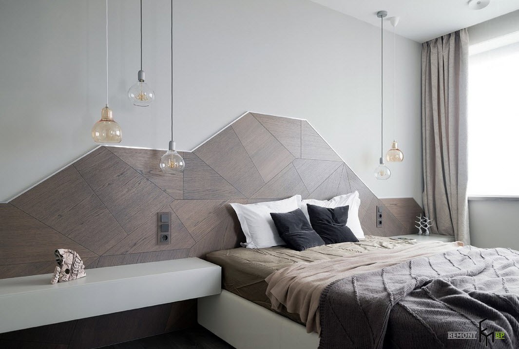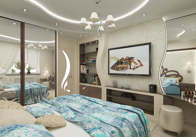 Отличной идеей для необычной и интересной отделки спальни является гипсокартон. Причем он не требует много денег и времени. Здесь можно воплотить любую фантазию: различные конструкции на стенах или потолке, ниши, можно и в виде прикроватных тумбочек и так далее.