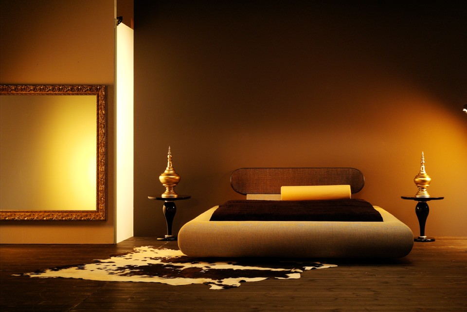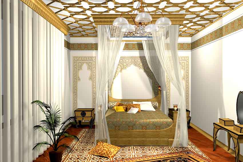 Итак, от восточного стиля вы можете взять «полный набор» или только общие идеи. Под «полным набором» подразумеваются все восточные атрибуты интерьера: контрасты ярких и пастельных цветов, натуральные материалы для отделки (металл, бамбук, дерево), широкие кровати с балдахином индийской направленности или японский матрас – футон, имеющий низкий подиум. Также для восточного стиля характерны низкие диваны с кучей подушек, резные сундуки с орнаментами и резьбой и шкаф – бусабак, который имеет множество ящиков для мелких предметов. Если оформлять спальню полностью по-восточному, то здесь, конечно, будет множество украшений свойственных данному направлению: веера, расписные керамические тарелки и вазы, деревья карликовых пород, абстракции из бамбуковых веток. Одним из интересных вариантов является использование больших подушек, они выполняют и функцию декора, и дополнительных посадочных мест. Также можно украсить стены одиночными яркими акцентами, например, кимоно пестрой расцветки, расписная ширма, покрытая лаком. Можно украсить тибетским ковром с вышитым драконом или лотосом. Добавим ко всему этому восточный текстиль, а именно: шелк, бархат, органза, муар, парча. И, несомненно, золотые украшения, бахрома, стразы, бисер и так далее.