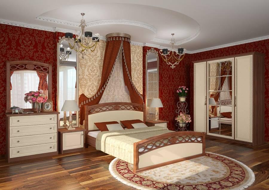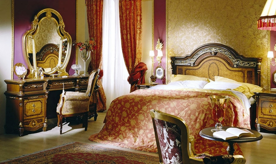 Для оформления спальни в историческом стиле (барокко, викторианский, ампир, рококо) необходимо, чтобы комната была просторной. Ведь главными атрибутами здесь будет массивная мебель с резными ножками или росписью, драпированные портьеры, большая люстра, резьба и так далее. Такая обстановка должна окутывать хозяев богатством и роскошью.