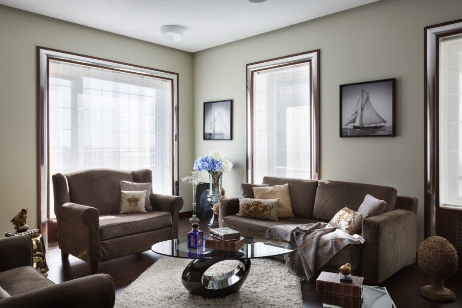 Отдельно стоит отметить интерьер гостиной в темно-зеленом, темно-коричневом или темно-фиолетовом цвете. Безусловно, такой вариант подойдет не всем. Он будет уместным исключительно в том случае, если окна выходят на солнечную сторону. Только при этом условии в гостиной будет достаточное количество дневного света. Если же у вас противоположный вариант, то лучше присмотреться к более теплым тонам.