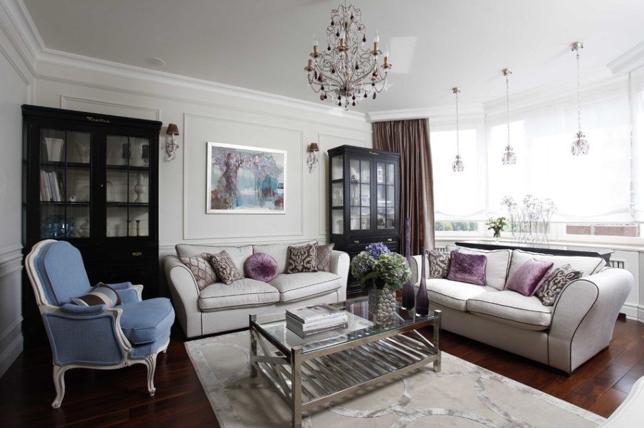 Все более актуальным вновь становится классический интерьер гостиной. Светлые оттенки, которые используются для оформления стен и пола делают помещение более теплым и уютным. Такая атмосфера всегда располагает к хорошему времяпрепровождению. Безусловно, играет роль и количество осветительных приборов. Довольно большие люстры, а также торшеры и светильники – все это уместно в классическом стиле интерьера гостиной. Процесс выбора мебели в данном случае будет не сложным, ведь она должна быть роскошной. К примеру, диван может иметь бархатную обивку. Это сделает его главным акцентом гостиной. Высокое качество должно быть буквально во всем, даже в декоративных деталях. Среди них текстильные элементы, различные вазы, шкатулки, подсвечники и многое другое.