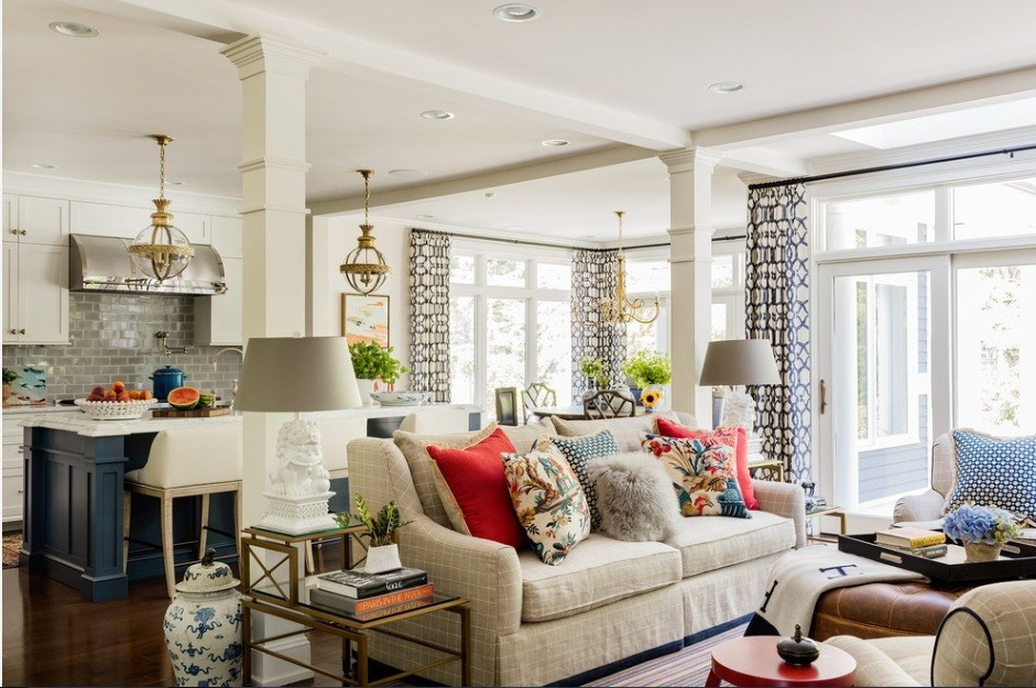 Пожалуй, самым популярным является объединение кухни с гостиной. Дизайнеры рекомендуют выделять ту или иную зону с помощью коврового покрытия, мебели и освещения. При желании можно сделать разным даже покрытие и цветовое решение для стен. Но в основном достаточно небольших акцентов. К примеру, большой мягкий ковер чаще всего обозначает зону отдыха. В то же время, стол со стульями подчеркивает зону для приема пищи. Используя такие простые приемы, получится грамотно разделить пространство, не возводя между зонами дополнительных стен и перегородок.