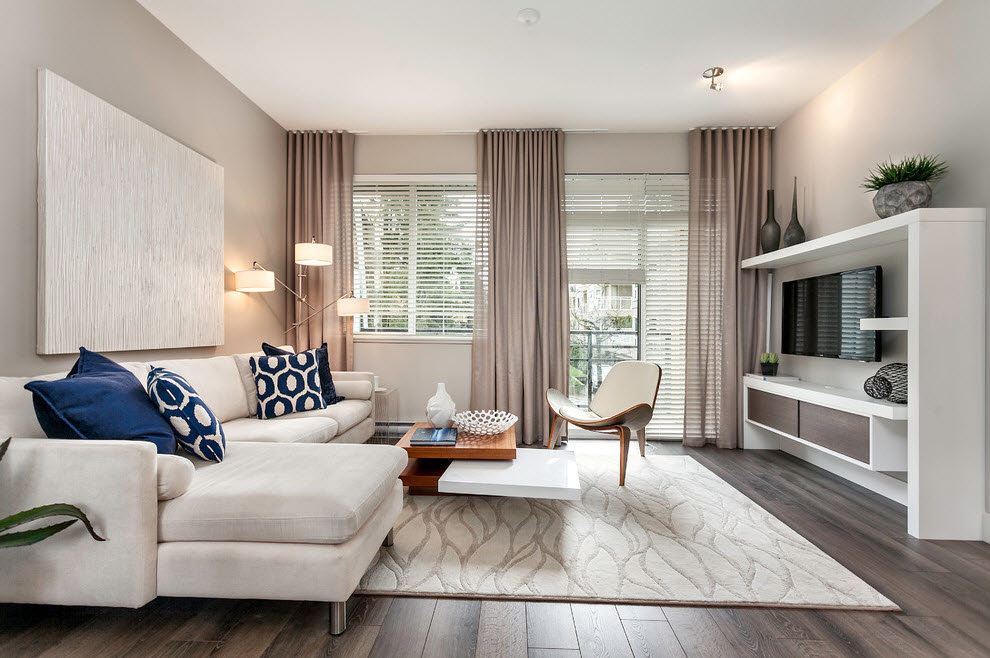 Цветовая гамма современного интерьера гостиной не слишком широкая. В основном стоит сделать упор на светлые оттенки. Они лаконичные, сдержанные, но при этом хорошо сочетаются со многими другими тонами. Благодаря этой особенности можно будет изменить интерьер гостиной, без кардинальных решений, даже спустя несколько лет. Не стоит отрицать актуальность ярких акцентов, таких как растения, торшеры или же декоративные подушки. Они могут быть той самой недостающей частью декора для уюта гостиной.