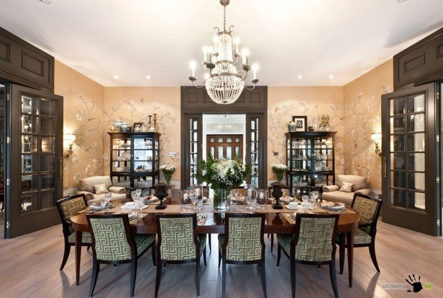 А это уже помещение главной столовой. Просторная комната с вместительным столом и удобными стульями-креслами способна принять немалое количество гостей. И вновь декорирование оконных проемов становится одним из ключевых аспектов концепции дизайна комнаты. Французские шторы из тафты шоколадного оттенка и текстильные панно с цветочно-анималистической тематикой притягивают взоры.