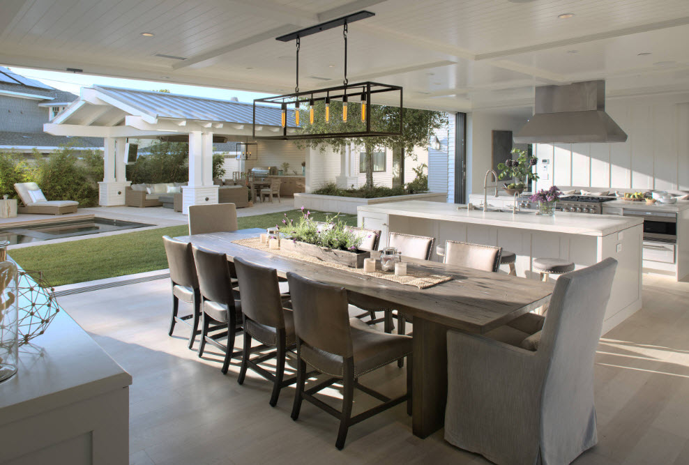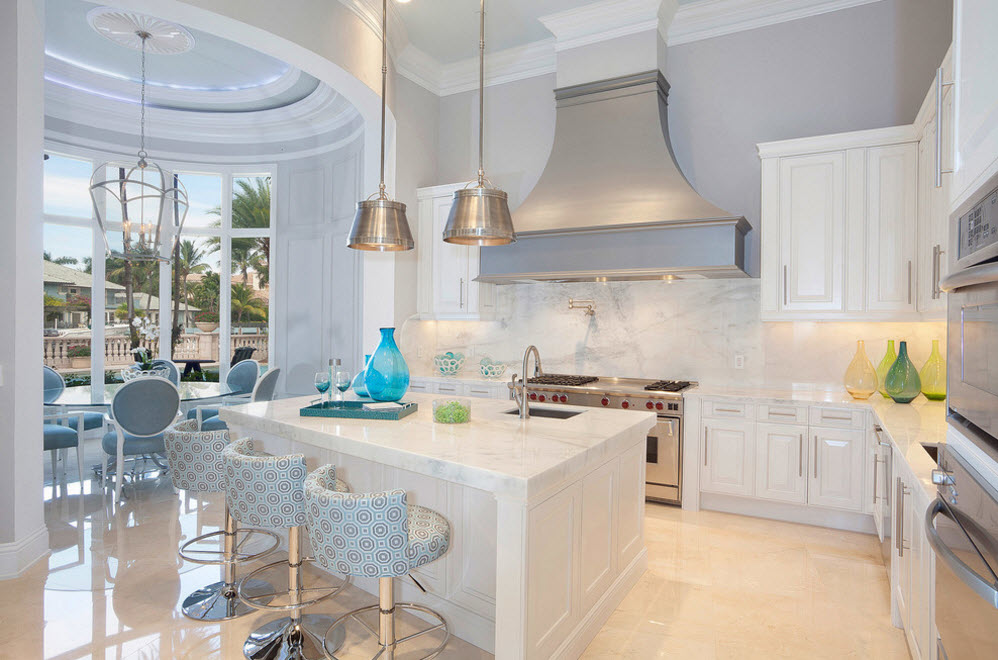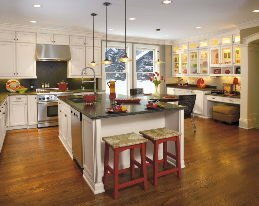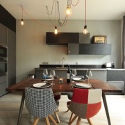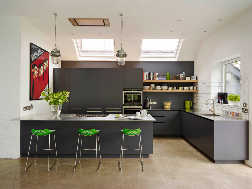 Оригинальные осветительные приборы – обязательный элемент оформления кухни в современном стиле. В кухонном пространстве недостаточно одного источника искусственного освещения, чаще всего с помощью встроенных светильников подсвечиваются рабочие поверхности зоны приготовления пищи. Редко какая кухня обходится без люстры в центре комнаты или над обеденным столом, где мы он не располагался. Именно для этого осветительного прибора часто отводится роль координационного центра, акцента интерьера, элемента оригинальности.