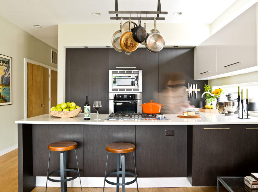 Большинство из нас предпочитают скрывать крупную посуду, среди которой кастрюли и сковороды, за красивыми фасадами кухонных шкафов. Но с активным ростом популярности использования в пространстве кухни такого элемента как кухонный остров, появилась новая тенденция. Новой, правда, ее можно назвать разве что для применения в российских квартирах и частных домах. В кухонных пространствах ресторанов и кафе такой прием сокращения времени на поиск нужной сковороды или сотейника используется давно и очень успешно. На специальный штатив, который крепится к потолку, подвешиваются на крючки сковородки. Иногда такую конструкцию заменяет подвесная вытяжка с креплением к потолку над кухонным островом или полуостровом.