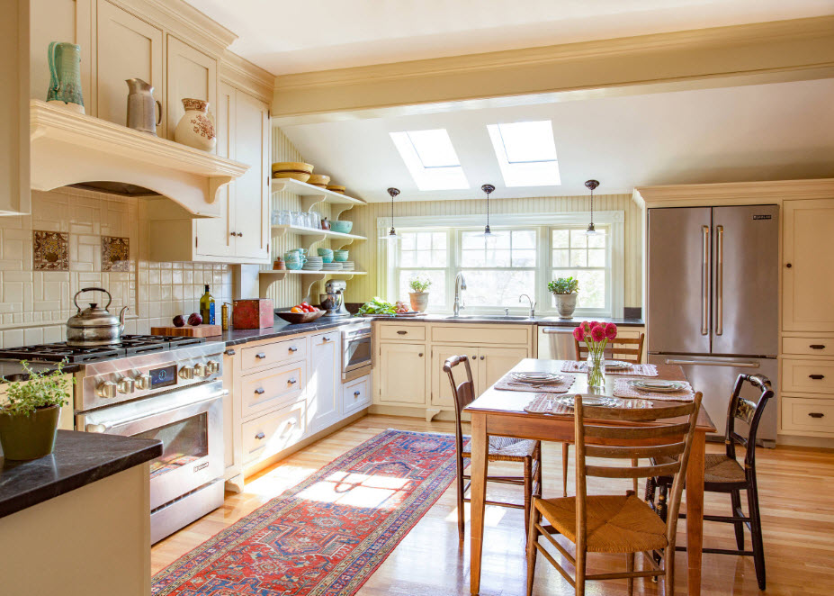 Кухню в стиле кантри украсят плетеные элементы. Это могут быть корзины и контейнеры из лозы или ротанга, элементы меблировки – спинки и сиденья стульев. Просто большая плетеная тарелка с фруктами в центре обеденного стола – прекрасное украшение кухни для создания определенного характера помещения, подчеркивания его индивидуальности. Аналогичный стилистический посыл несут подносы и сервировочные коврики, наличие которых на обеденном столе делает любую трапезу схожей с походом в колоритный ресторан.