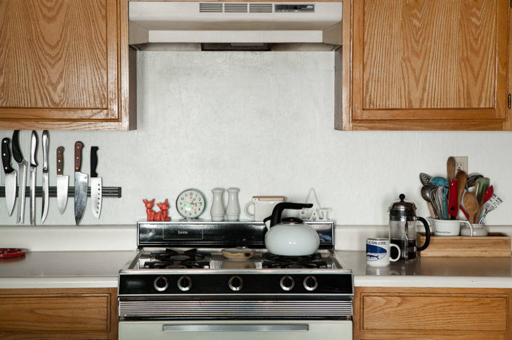 Удобным приспособлением является магнитная полоса или штатив, который крепится в зоне кухонного фартука. На такой полосе легко и удобно хранить разномастные ножи и друге кухонные аксессуары, выполненные из металла.