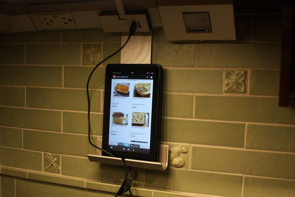 Для современных гаджетов, которые стали частью рабочего процесса для многих хозяек (хозяев), придумано немало дополнительных приспособлений, облегчающих эксплуатацию и защищающих приборы от различных видов воздействий. Подставка под кулинарную книгу трансформировалась в приспособление для фиксации планшета, на котором вы можете видеть не только список ингредиентов блюда, но и видео-инструкцию по его приготовлению. Если планшет или телефон планируется закреплять в зоне кухонного фартука (чтобы он находился всегда под рукой и перед глазами), имеет смысл здесь же оборудовать розетку для возможности зарядки устройства. Ведь электрический провод вам все равно придется тянуть для создания подсветки рабочих поверхностей.