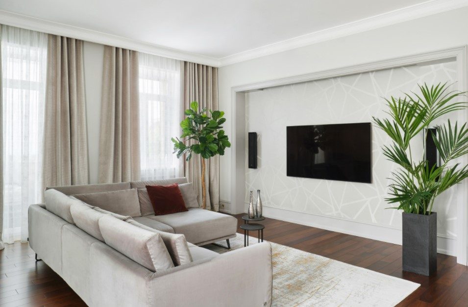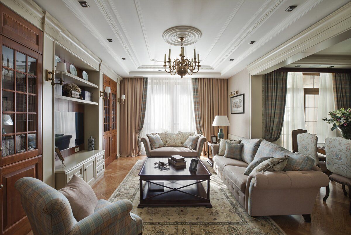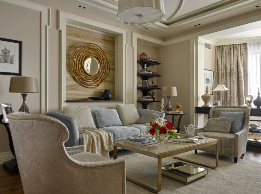Гостиная в стиле американская классика выгодно отличается следующими особенностями: функциональность, высокий уровень комфорта, симметричная планировка комнаты, возможность объединения с соседними комнатами, наличие элегантных арок и парных элементов декора.