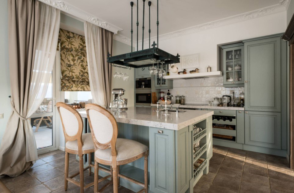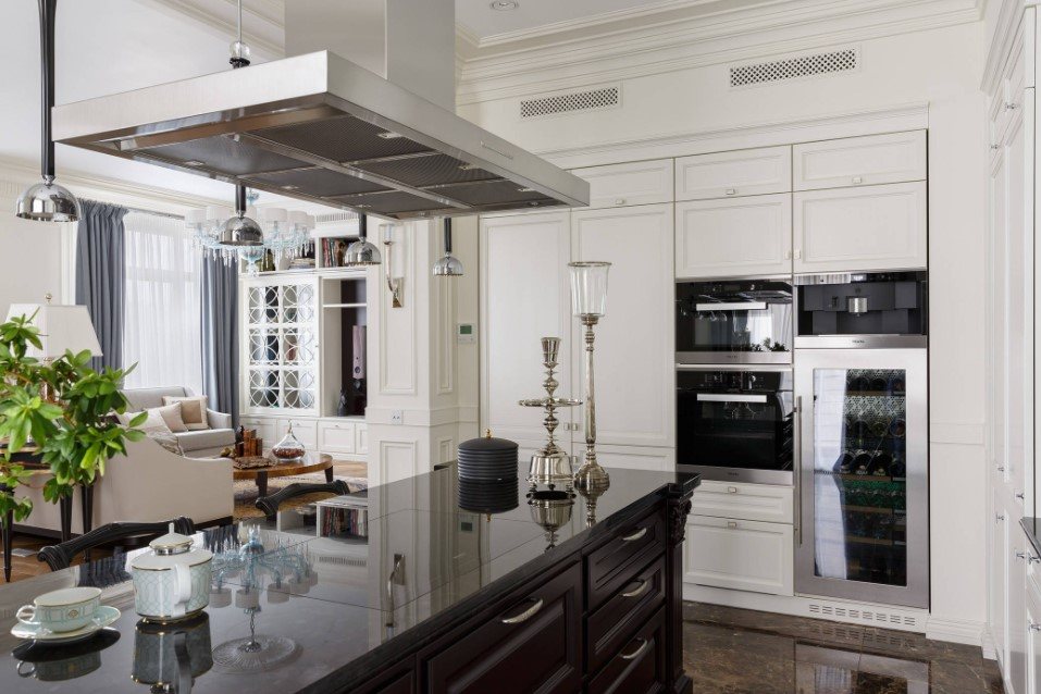 Современный классический американский стиль сохраняет традиционные стильные тенденции, при этом он максимально актуализируется в соответствии с требованиями времени. Это касается, например, технического оснащения кухни и ее функциональных зон современной высокотехнологичной крупной и мелкой бытовой техникой.