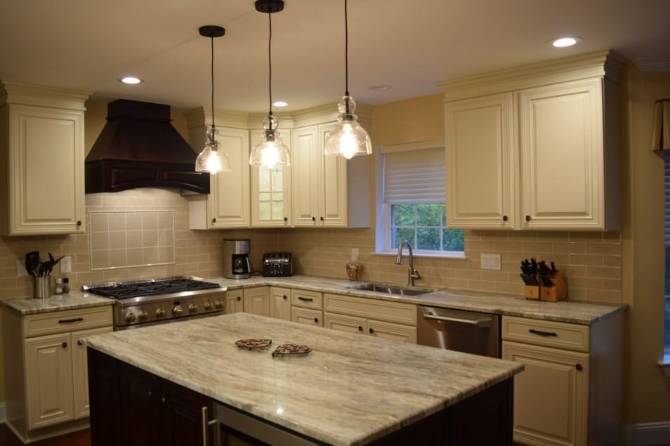 Дизайн интерьера кухни этого стиля начинается с деления на три обязательные для американской классики функциональные зоны с отдельным освещением: обеденная, барная, рабочая. Традиционно мойка располагается под окном, вся мебель, кроме центрального островка с обеденной зоной, размещается по периметру кухни.