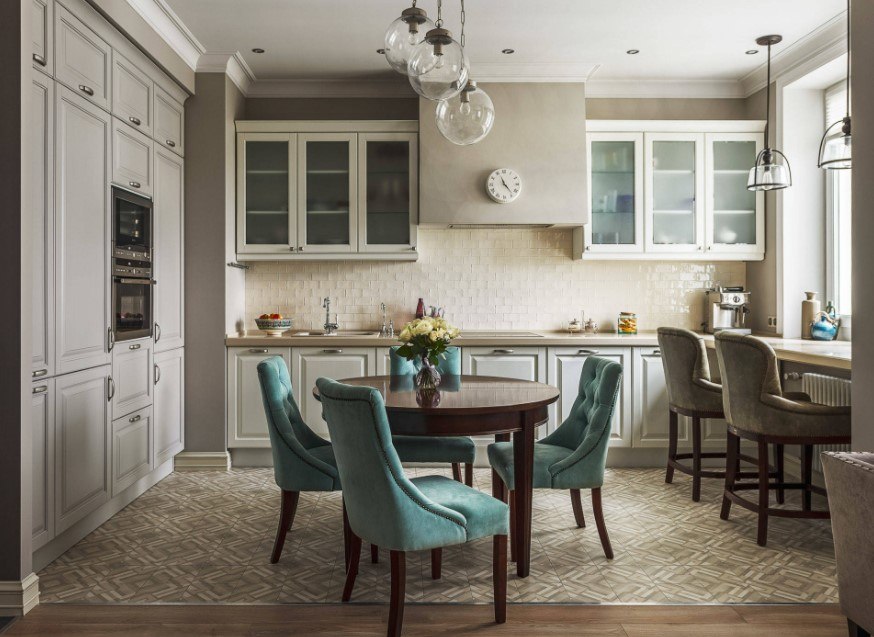 Основным цветом для отделки поверхностей кухни, чаще всего, выбирают светлые оттенки покрытий в сочетании с контрастным цветом других элементов интерьера, например, мебель натурального древесного цвета.