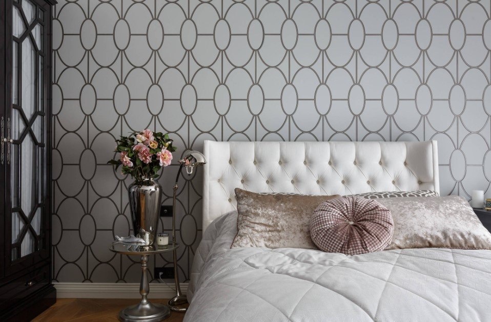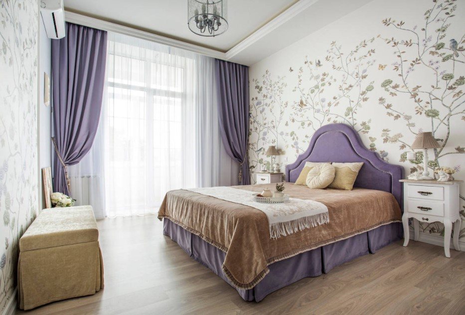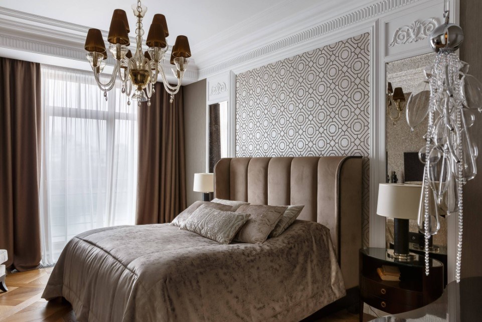 Интерьер спальни оформляют, начиная с центра – большой двуспальной кровати с красивым изголовьем, на ножках. По обе стороны изголовья кровати располагают элегантные тумбочки, а в ногах – оригинальную банкетку. Стену над кроватью украшают фотографиями, картинами в изысканных рамах или багетах.