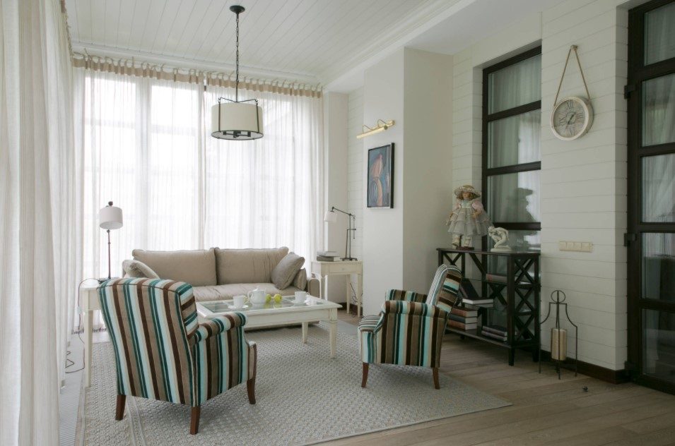 В гостиной центральным стильным элементом является настоящий или имитированный камин с зеркалом или картиной в раме над ним. А вот непосредственно центром интерьера является мягкая мебель из натуральных материалов, вокруг которой располагают остальные предметы мебели. Также возможно соединение в гостиной двух зон: отдыха и медиазоны.
