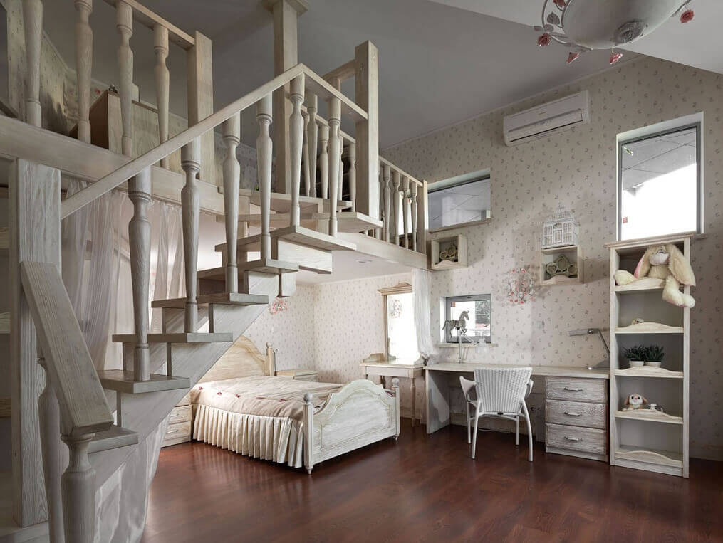 Обустройство в детской комнате антресольного этажа имеет несколько основных и весьма удачных вариантов. Например, с помощью данной конструкции функционально зонируют детскую: на втором этаже располагают игровую зону, а на первом спальную зону. Если ребенку по возрасту уже необходима учебная рабочая зона, то можно кровать поднять на антресольный этаж, а игровую и рабочую обустраивают на первом этаже детской комнаты, или наоборот. Если в семье несколько детей, то с помощью антресоли можно разграничить личные зоны для каждого ребенка.