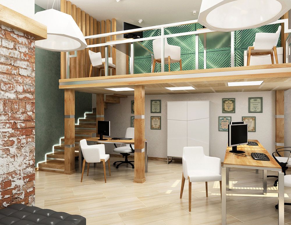 Распространенным решением в том случае, если антресольный этаж находится над кухней или гостиной зоной – это обустройство рабочего кабинета, зоны для хобби и отдыха или домашней библиотеки. В этом случае площадка может быть небольшого компактного размера и оснащена не стеллажами, а настенными полками, для рабочей зоны достаточно стола и пары стульев.