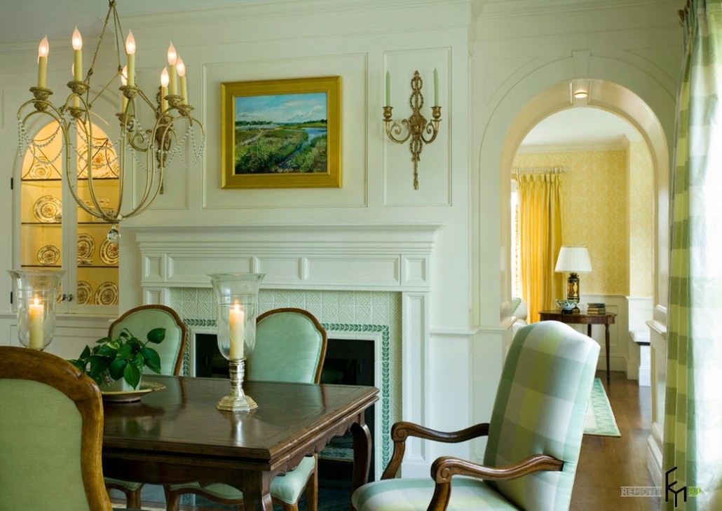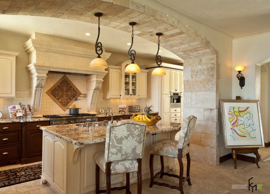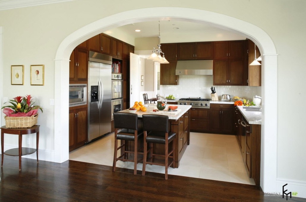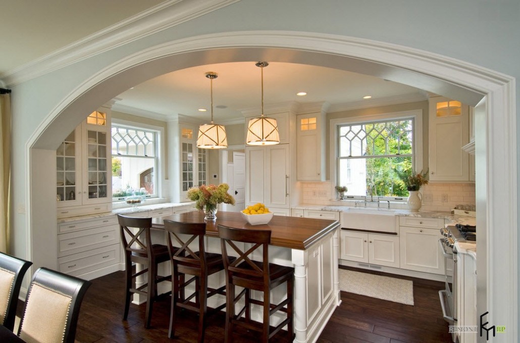Между кухней и столовой будет целесообразно соорудить широкую арку с барной стойкой. В помещении кухни, выполненной в деревенском стиле, неплохо смотрится арочная конструкция, имитирующая домашний очаг. Такую арку можно отделать под камень или кирпич.