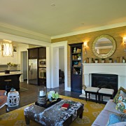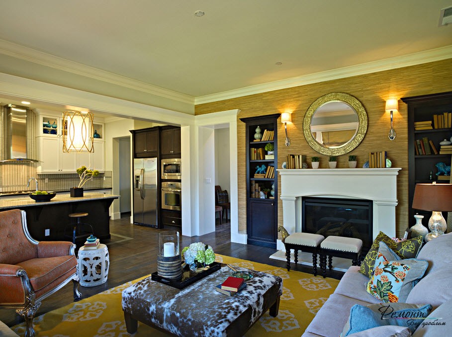 Отлично бамбуковые обои впишутся и в интерьер гостиной в колониальном стиле с огромным темным бархатным диваном, кожаными пуфами и широким потолочным карнизом с замысловатым орнаментом.