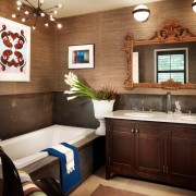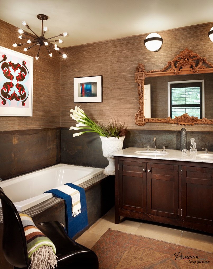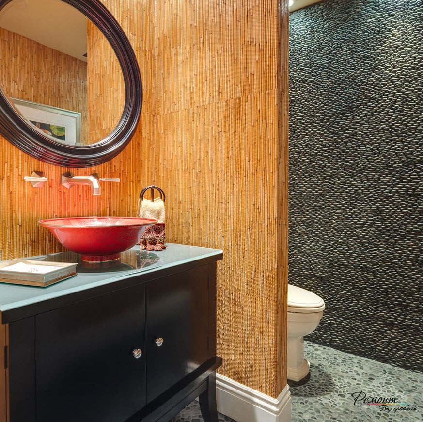 Отделка стен бамбуковыми обоями будет уместна в абсолютно любой комнате. И как уже говорилось, она может быть либо полной, либо частичной. Например, в ванной отлично будут смотреться стены с кафельными панелям и обоями из бамбука. Отлично будут смотреться и полностью светлые бамбуковые стены, которые с белой сантехникой и бежевой мебелью создадут оригинальный ансамбль. В такую ванную легко можно включить отделку стен и пол из натурального камня.