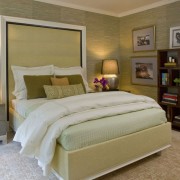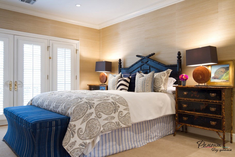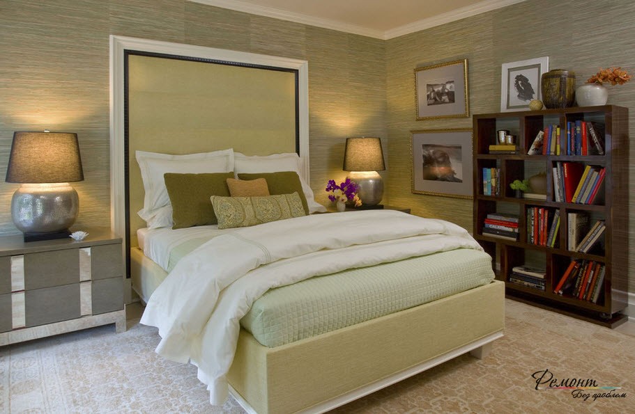 Бамбуковые обои хорошо подойдут и для отделки в спальне. Именно этот материал внесет в помещение комфорт и уют, добиться которого желает множество хозяев. Светлая кровать в таком интерьер будет как раз кстати. И независимо от размеров она будет казаться легкой и не утяжелит пространство. Хорошим контрастом в такой комнате станет открытый стеллаж или комод и темного дерева.