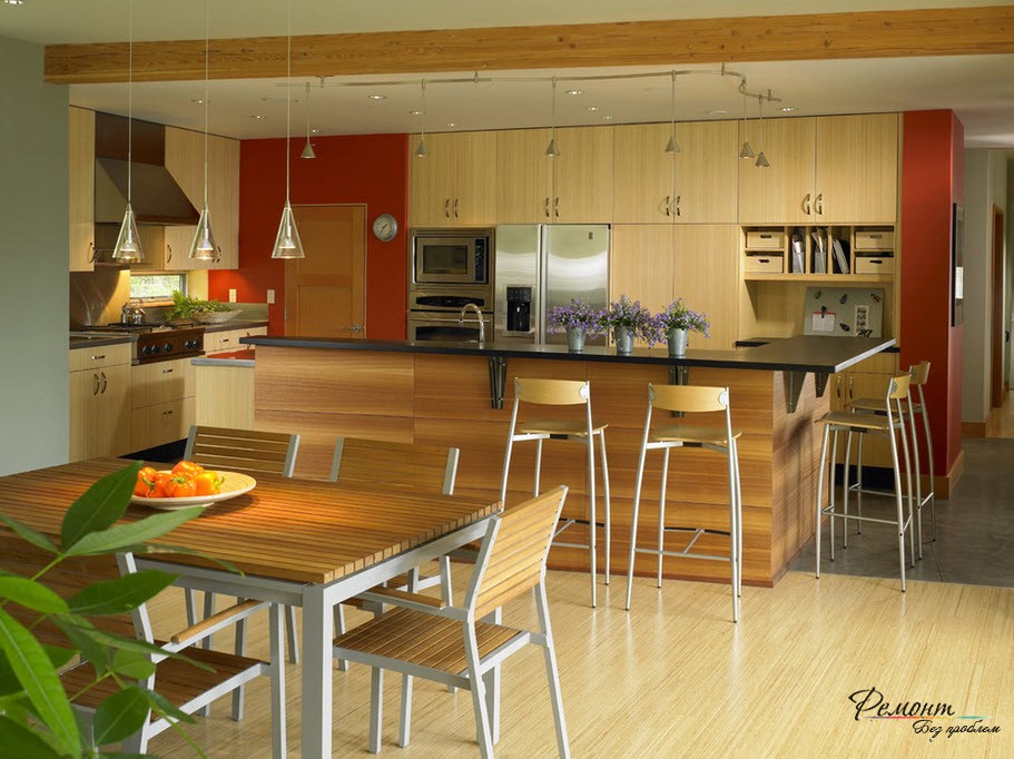 Не исключение для использования обоев из бамбука стала и кухня. Теплые оттенки золотистого бамбука сделают это важное помещение максимально комфортным. А чтобы пространство не казалось скучным и смазанным его можно разбавить яркими и насыщенными цветами, комбинируя бамбук с окрашенными стенами.