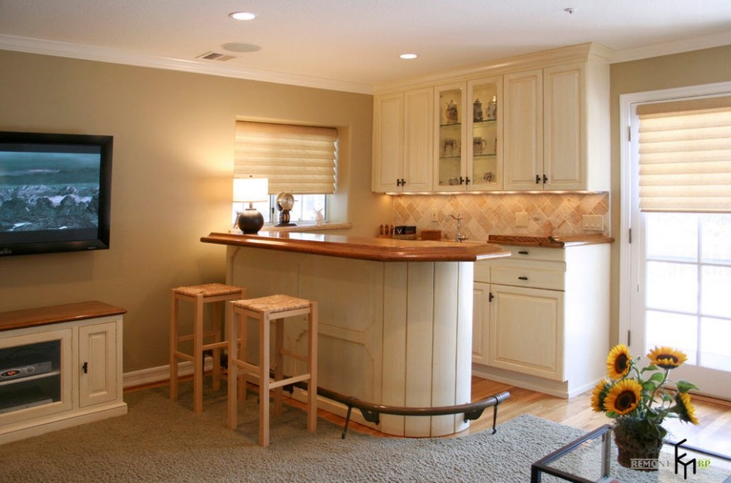 Если вы являетесь счастливым обладателем кухни-студии, прекрасным вариантом реализации барной стойкой станет её установка на границе двух зон — гостиной и кухонной. В таком случае к общему функционалу прибавится ещё и роль перегородки, которая будет изящно разделять пространство на две части, не нагромождая обстановки.