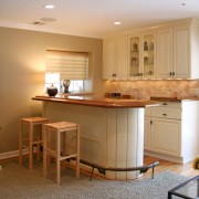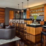 Круглые барные стойки лучше всего смотрятся на больших кухнях или в гостиных. Здесь они превращаются в своеобразный островок отдыха и веселья, на котором забываются все проблемы и невзгоды, особенно если компанию составляют хорошие друзья. Если круглую форму сложно вписать в интерьер, современные дизайнеры используют широкие прямоугольные стойки, но соблюдают принцип «острова», дабы не нарушать атмосферу этого стиля.