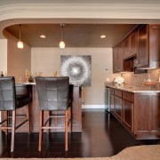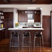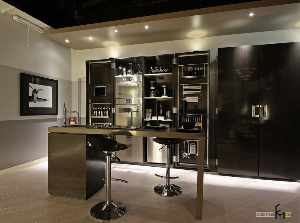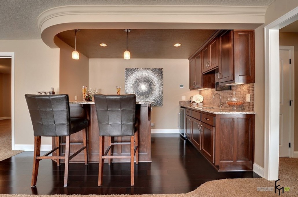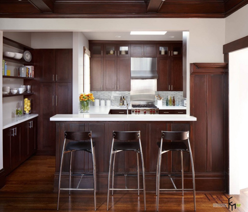 Барная стойка, установленная на кухне — классический подход к решению этого вопроса. Бесспорно, лучше варианта и не найти, ведь здесь этот предмет интерьера может отличиться своей многофункциональностью, одновременно исполняя роль стола, места для приготовления напитков и просто необычного элемента дизайна, который заслуживает отдельного внимания. Тем не менее стоит помнить, что барная стойка — это не отдельный предмет мебели, а деталь общего кухонного гарнитура, который необходимо умело скомбинировать.