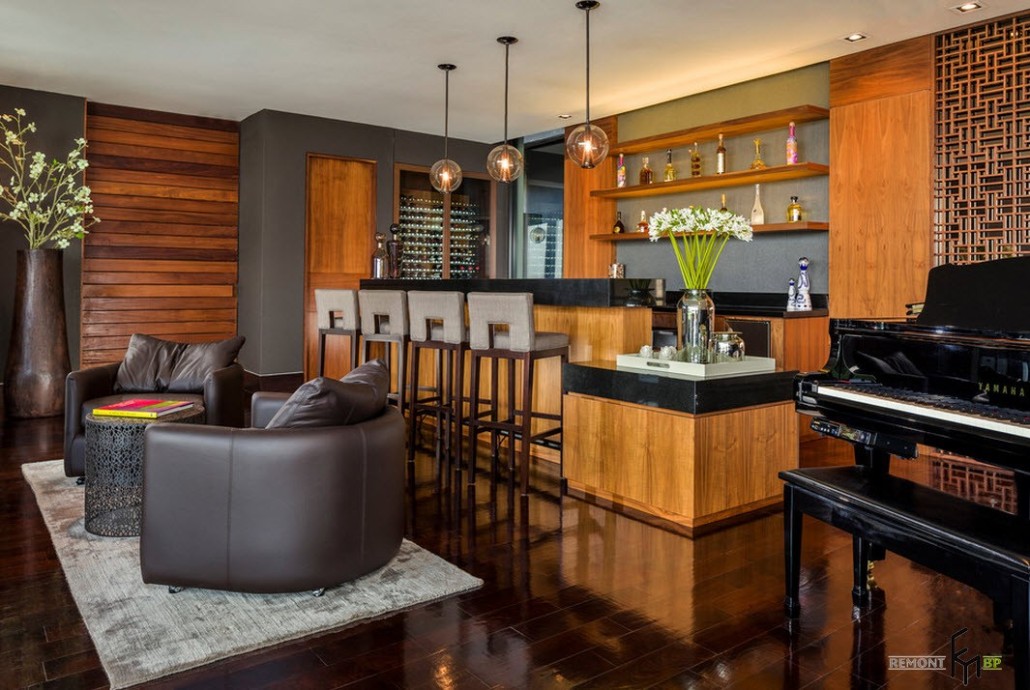 Лучше всего устанавливать «барную зону» напротив телевизора, дабы во время дружеских посиделок превращать свою квартиру в настоящий кинотеатр. Если же дизайн и габариты вашего дивана сочетаются с внешним видом барной стойки, то не объединить эти два предмета интерьера — настоящее кощунство. Кроме того, что таким образом практически вдвое увеличивается количество посадочных мест, но и реализовывается мечта «ленивых», ведь пульт или газету теперь можно положить на столешницу просто за спиной.