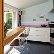 Не менее оригинальное решение расположить барную стойку у окна также достаточно популярно у современных дизайнеров. Если из вашего окна открывается прекрасный вид на небольшой скверик или зелёный дворик, где любят гулять ваши дети, лучшего месторасположения для этого предмета интерьера не найти. Сидеть на кухне, наслаждаться ароматным чаем, проводить время за ноутбуком, работая или просто просматривая новостную ленту, и одновременно успевать одним глазом следить за своим непоседливым чадом — что может быть прекраснее?