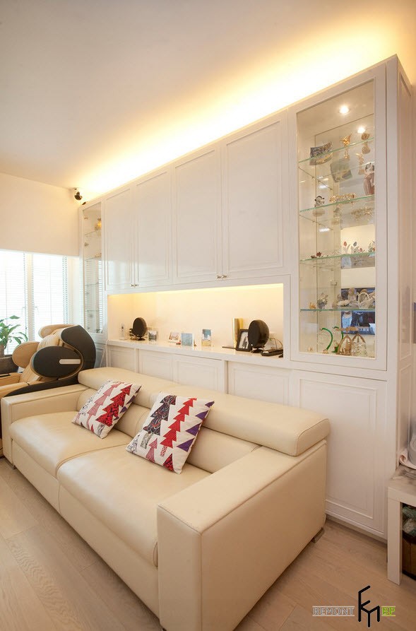 В вечернее время эстафета переходит к линейному освещению, симметрично вмонтированному на потолке. При всей яркости верхних ламп в дополнение к основному сценарию эксплуатируются зональные схемы. И, хотя присутствие массивных предметов не приветствуется в небольших комнатах, высокая секция не повлияла на пропорциональность периметра. Благодаря ее лаконичному дизайну и совпадению силуэта с другими составляющими группы, размещению кухни с противоположной стороны, пространство удалось уравновесить.