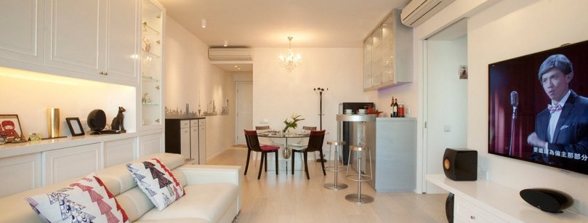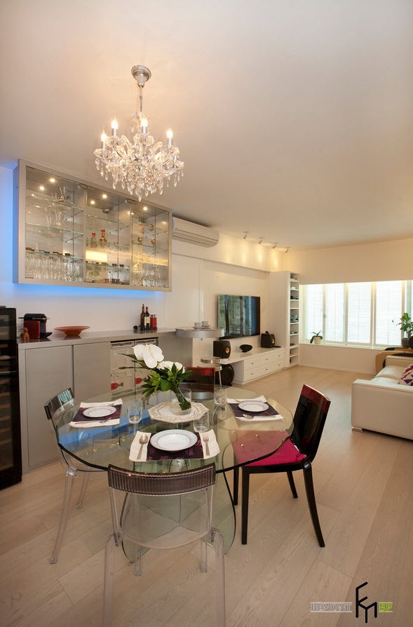 Частичное использование стеклянных перегородок, эксплуатация прозрачного материала в кухонных предметах, кипенно-белые стены и идентичный цвет базовых интерьерных фасадов ассоциируются с арктическим безмолвием. И все же, целесообразность эксплуатации чистого цвета очевидна. Фон и мебельная группа сливаются в хоровом созвучии и растворяются в активности дневных потоков, попутно создавая камерную атмосферу. Открытое окно во всю стену достоверно транслирует настроение погоды, что отражается на восприятии дизайна. Встроенный невысокий шкаф в области подоконника предоставляет дополнительную плоскость для разведения мини-оранжереи.
