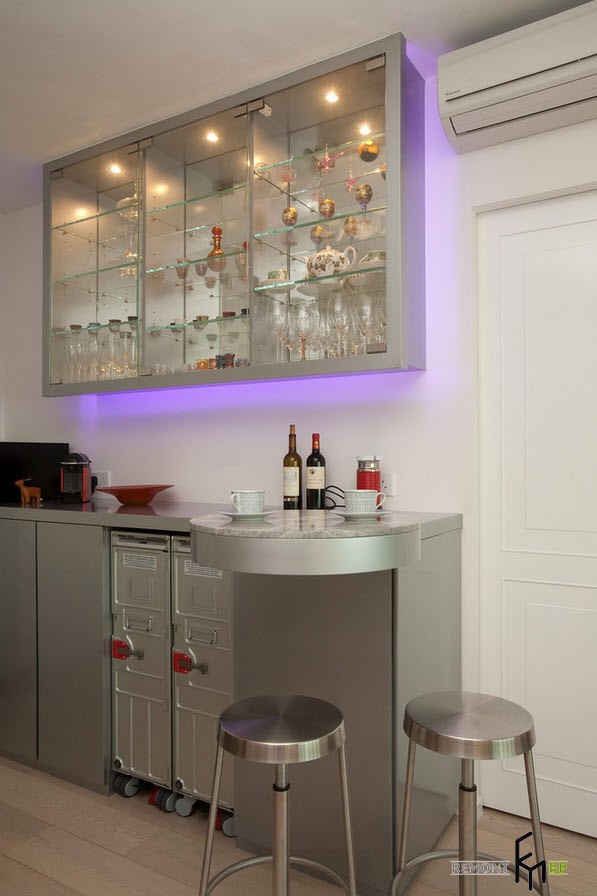 Металл, стекло и продуманные цветные акценты, практичные предметы и высокие табуретки с фрагментарным хромированием конкретно указывают на хай-тек.