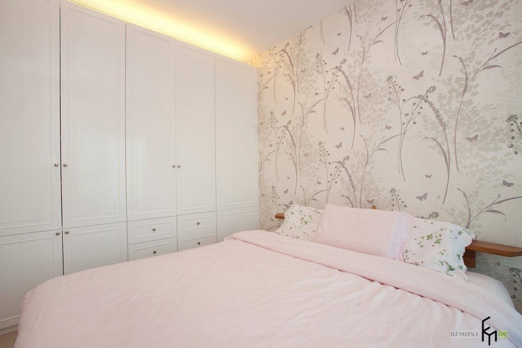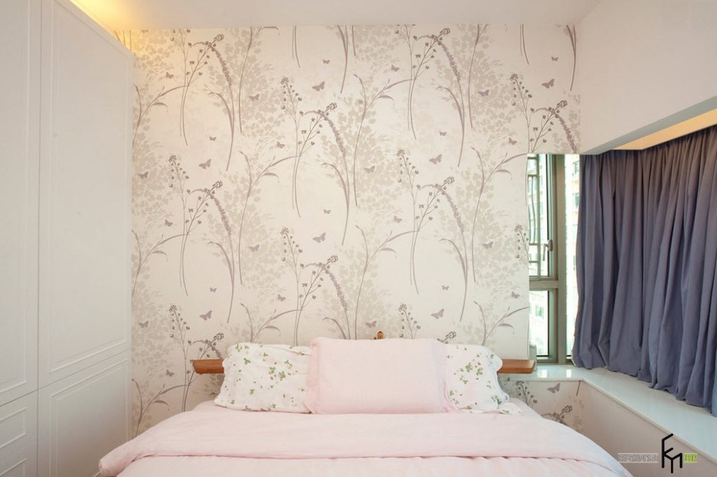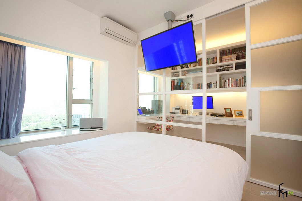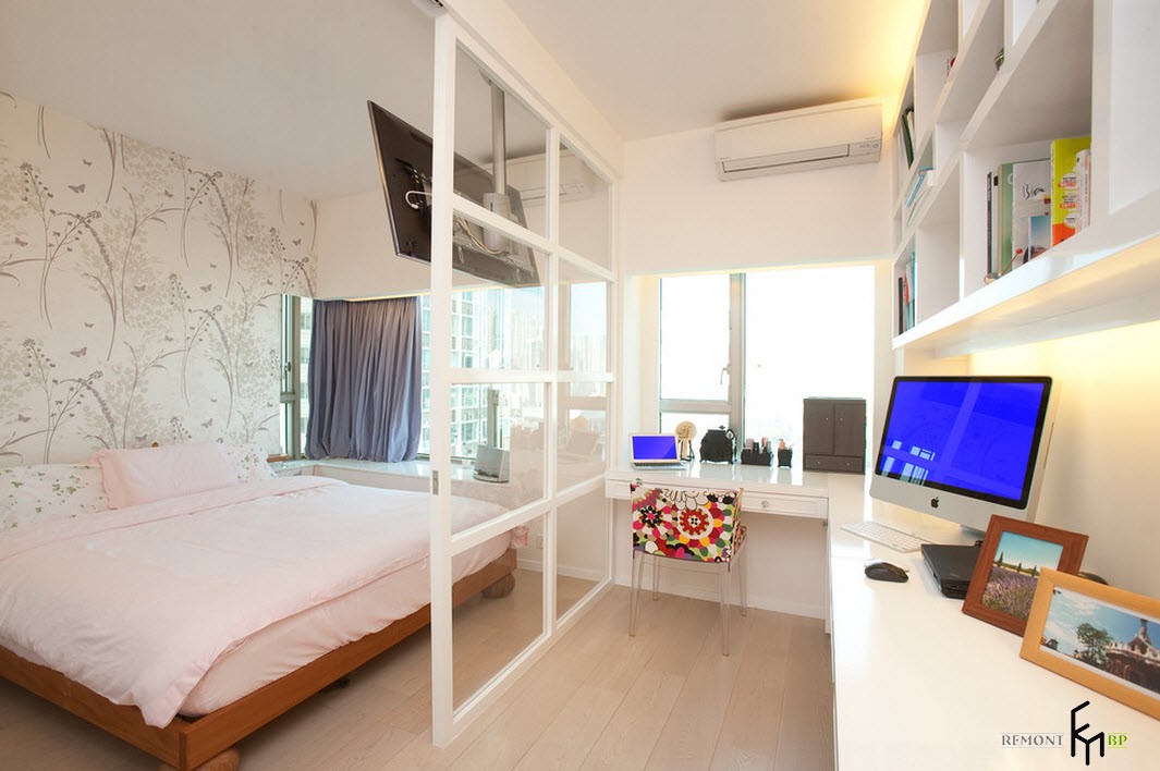 Статичная стеклянная перегородка удачно разделило комнату поровну, образовав новый формат. Сизо-голубые шторы и флористический мотив обоев создают приятную ауру. Белому шкафу во всю стену вторит встроенная тумба, виднеющаяся на горизонте окна. Подвешенный телевизор – показатель грамотной эргономики. В целом, оформление в северных традициях скорее симулирует к работе, чем к отдыху.