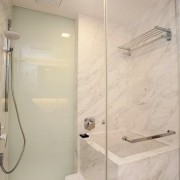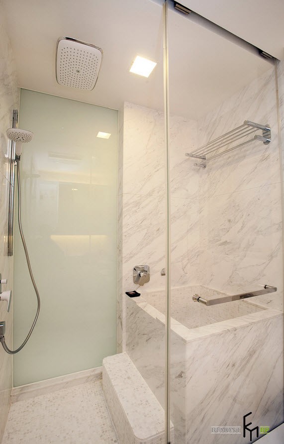 В ванной комнате поддерживается заданная концепция. Природный дизайн мрамора отвечает за декор. Хаотичные черные разводы по серой глади камня эстетично смотрятся на общем фоне.