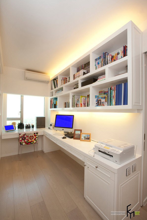 Через открытый портал виднеется совмещенный периметр кабинета-спальни. Тот же белый фон, витрины полок, обилие дневного и вечернего света. Цвет пола нивелирует ощущения скучного квадрата. В солидарности разноцветных книжных переплетов, коричневого обрамления рамок и корпуса кровати, веселой обивки стула дизайн приобрел динамичность, отчего односложный фон стал восприниматься оптимистично.