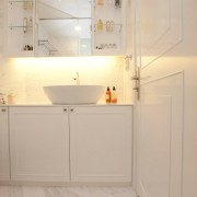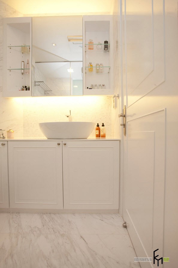 Перламутровый фартук над умывальником подчеркивает хороший вкус хозяев. Высокие навесные шкафы со стеклянными витринами красиво отражают свет на жемчужных фасадах мебели. Элегантно, стильно и практично, что и требовалось воплотить в реальность согласно дизайнерской задаче. Как видно из проиллюстрированного проекта, всегда есть возможность создать желаемое настроение.