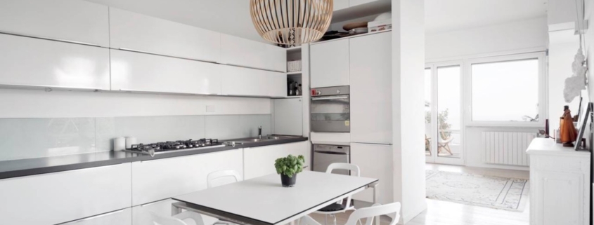 Белая минималистичная кухня создает простую и спокойную атмосферу. Белая мебель для кухни в интерьере гармонично сочетается с однотонной и цветной отделкой стен, элементами из натурального дерева или «под дерево», каменными столешницами, фартуком яркого оттенка над рабочей поверхностью кухонного стола.