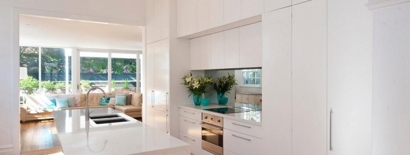 Одним их самых распространенных цветовых вариантов из всего многообразия палитры для оформления кухонного пространства является белый цвет и его оттенки. В белоснежных тонах выполняют отделку и мебель – корпусную и встроенную, используют белый цвет для аксессуаров и предметов декора. И дело не только в том, что светлые тона расширяют пространство, зрительно увеличивают площадь кухни. С белоснежным цветом отделки прекрасно сочетаются любые цветовые решения встроенной системы шкафов, палитра бытовой техники, текстиля и кухонных мелочей. И за светлым помещением, вопреки первому впечатлению, гораздо проще ухаживать, а ведь кухня – это место, где есть много поводов для загрязнения, и уборка происходит часто.