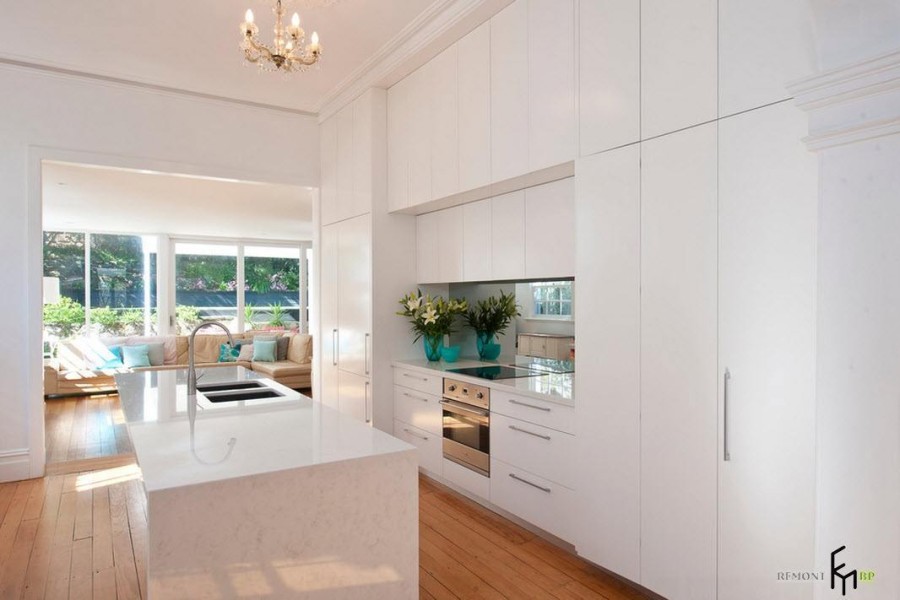 Белоснежная отделка стен и потолка, безусловно, нуждается в некотором цветовом отступлении, если кухонные шкафы также выполнены в светлых тонах, то привнести цвет в интерьер можно с помощью системы освещения, напольного покрытия, каменных или деревянных столешниц острова и рабочих поверхностей, а также аксессуаров и декора.