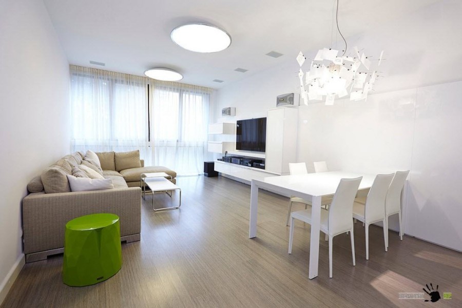 Начнем наш осмотр с самого просторного помещения квартиры, совмещающего в себе функции гостиной и столовой. Белоснежную отделку стен и потолка разбавляет древесный оттенок напольного покрытия и пастельные тона обивки мягкой мебели. Лишь темные пятна видеотехники выступают в качестве контрастных акцентов.