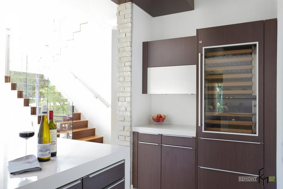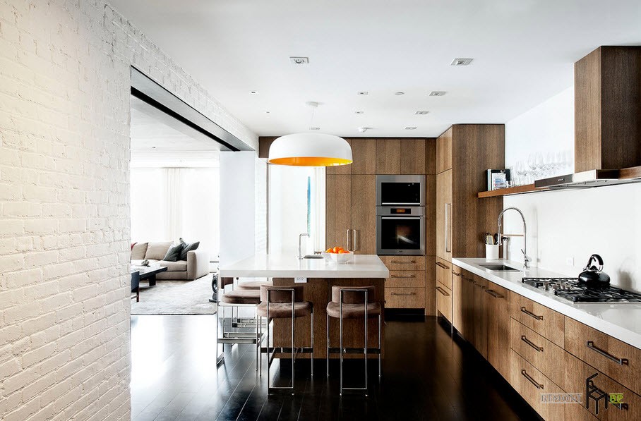 В кухонном помещении белая кирпичная кладка смотрится также весьма интересно. Светлым кирпичом можно украсить не только кухонный фартук, но и барную стойку. Этот материал прекрасно сочетается со всей современной кухонной техникой.