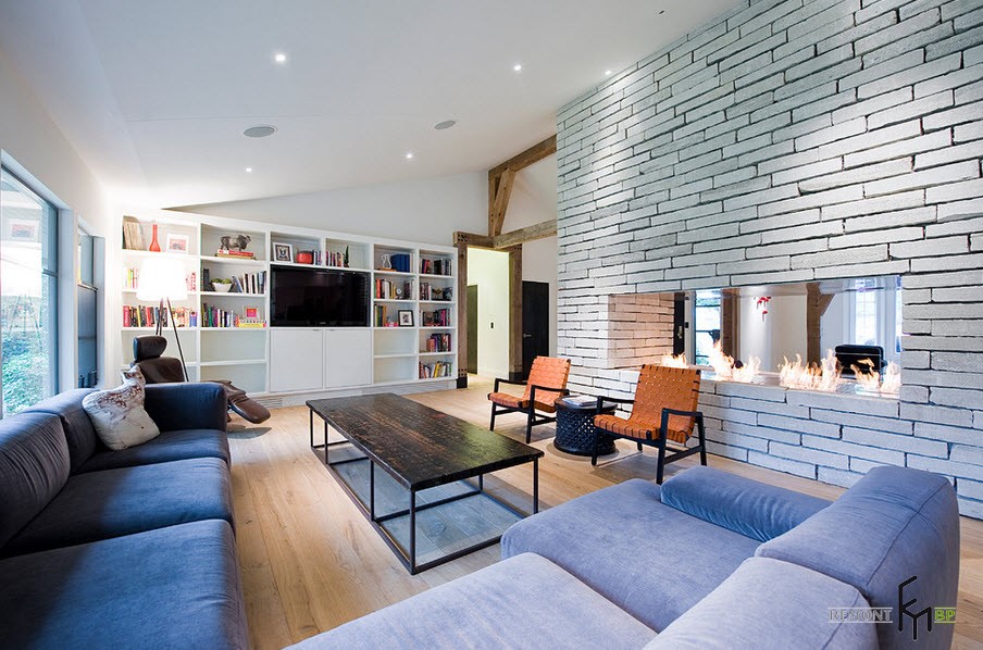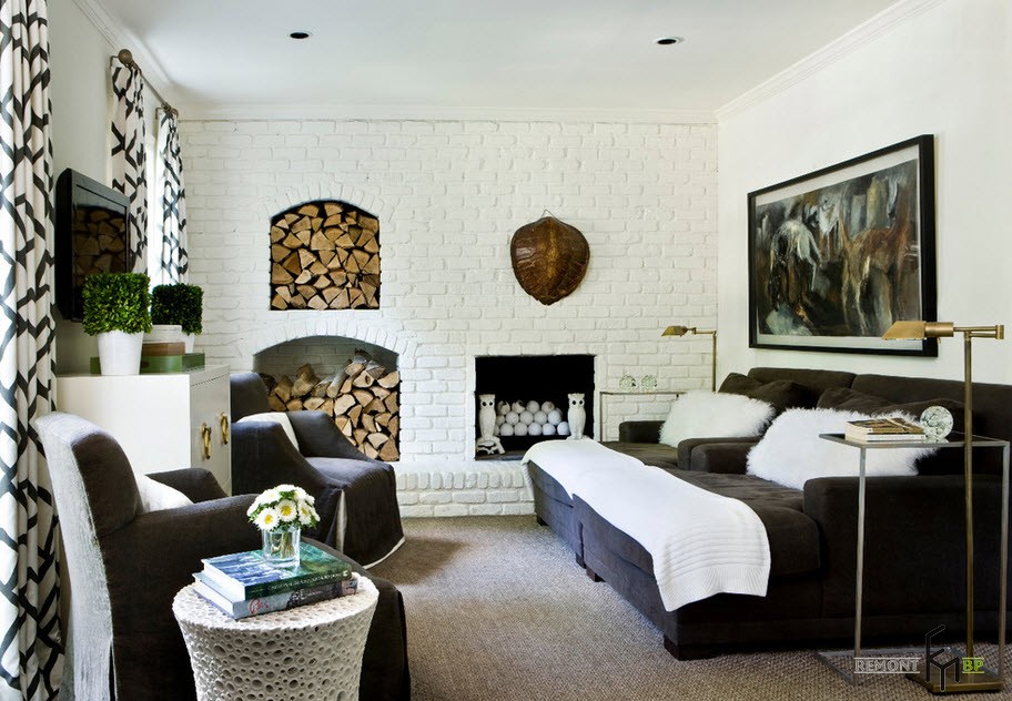 Для облицовки гостевого помещения можно отвести не одну, а целых две стены. Неотъемлемым элементом современной гостиной является камин, отделанный белым декоративным материалом. При его облицовке очень пригодятся такие качества кирпича, как огнеупорность и устойчивость к растрескиванию. Сплошную облицовку камина можно заменить его частичным декором.
