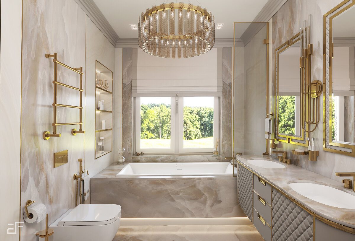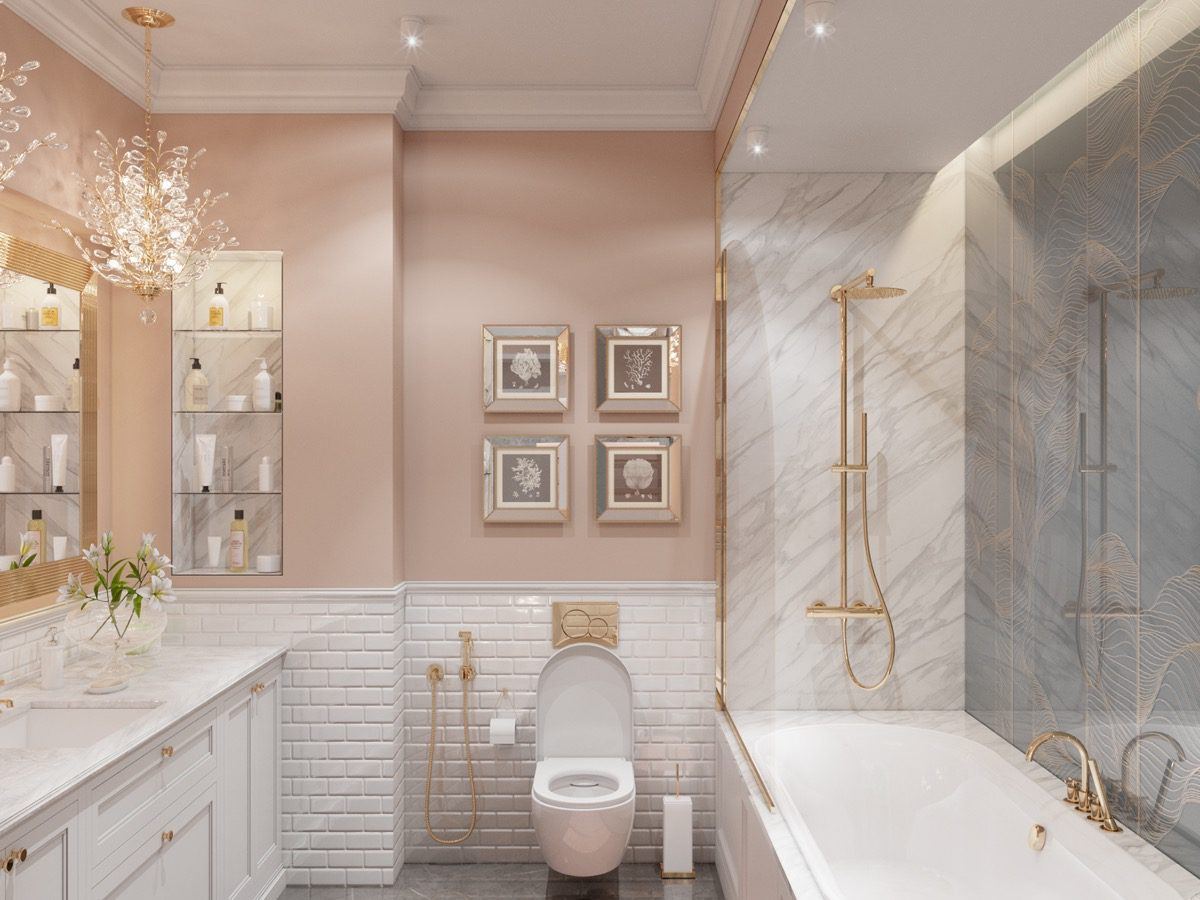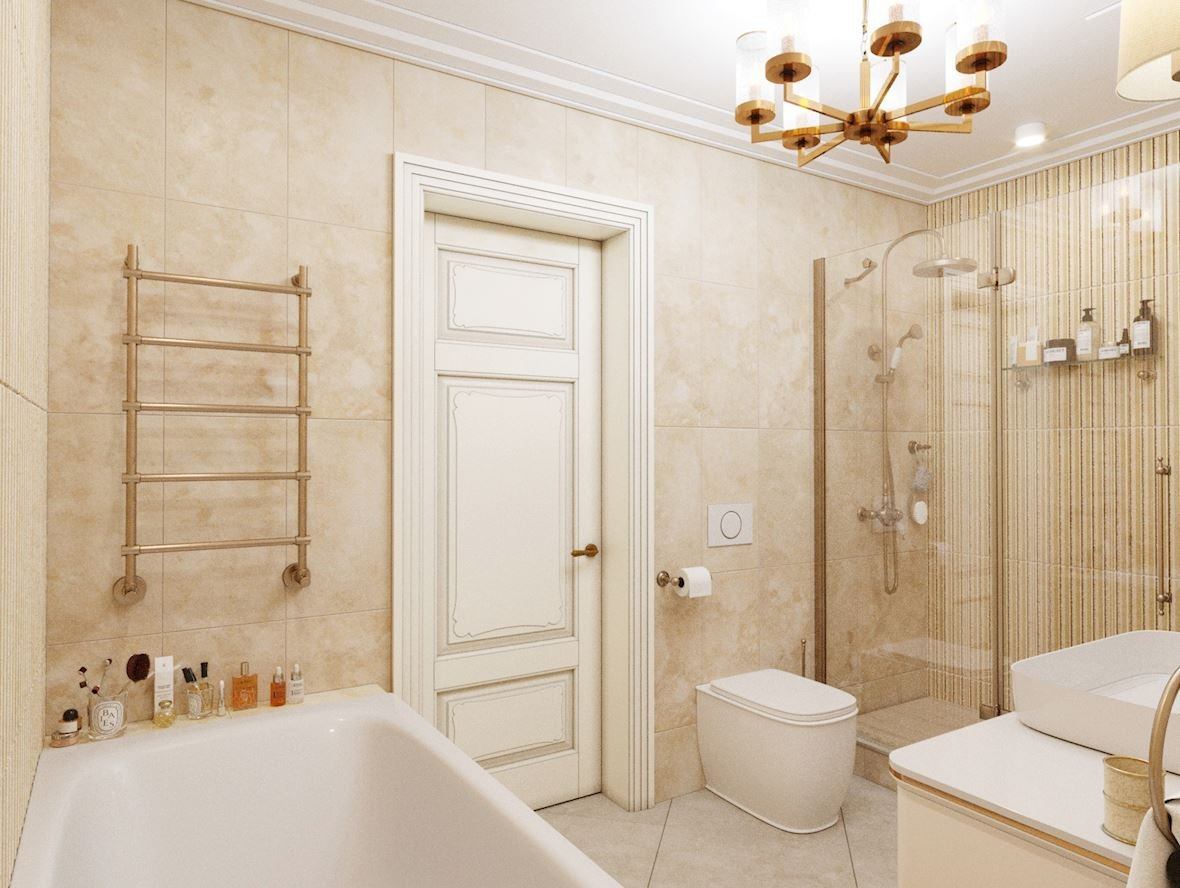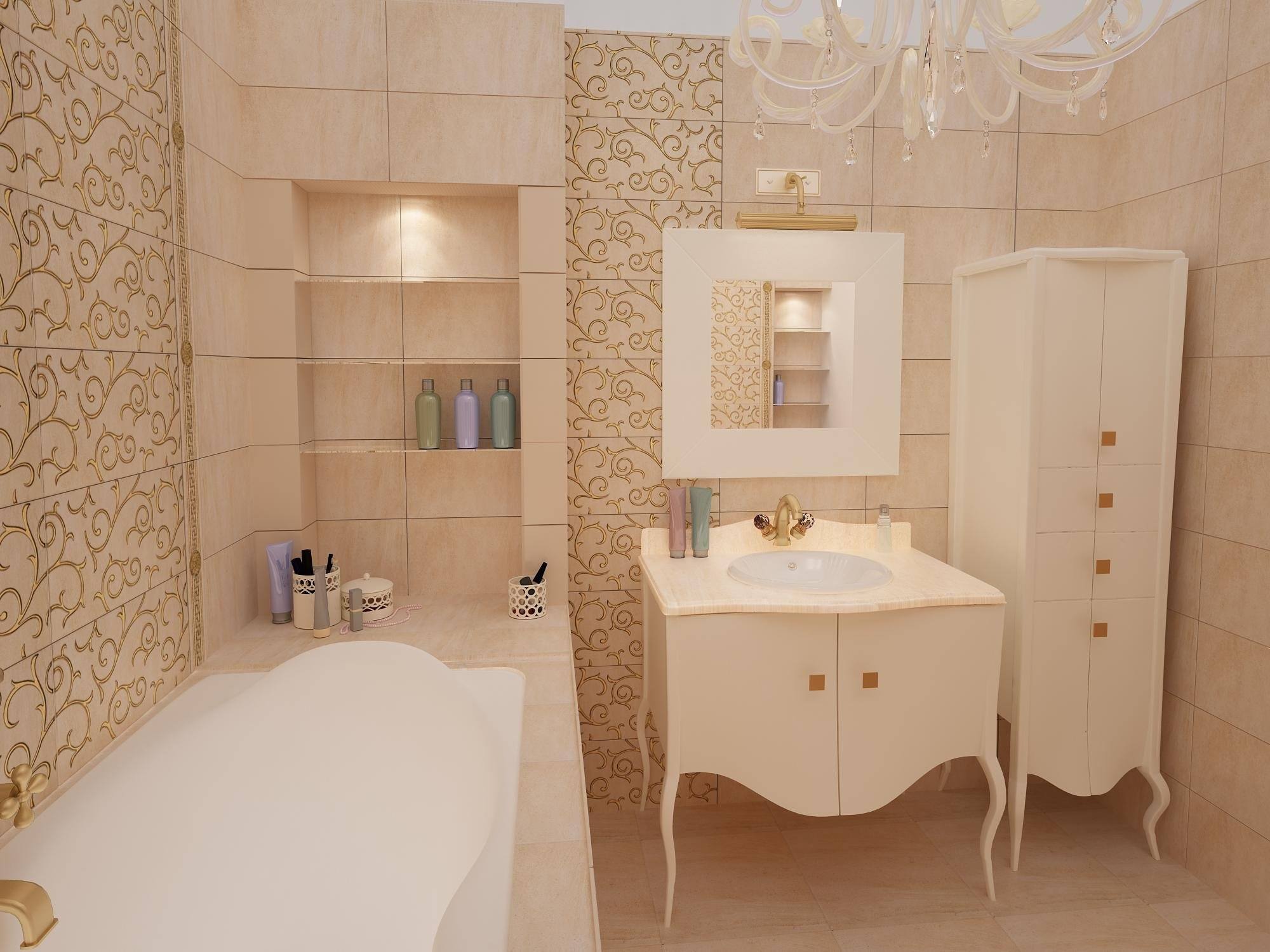 - Добавьте настенные или потолочные светильники для создания уюта и тепла. Можно выбрать светильники с бежевыми абажурами или золотистыми металлическими элементами, чтобы они сочетались с общим дизайном ванной комнаты.
