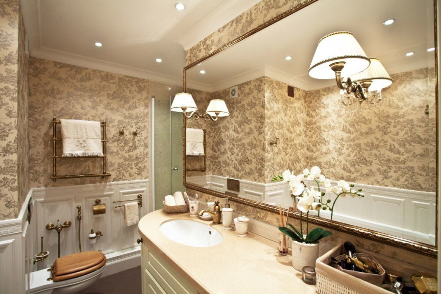 - Используйте дополнительные источники света, такие как настольные лампы или торшеры, если это необходимо для чтения или других задач. Эти светильники могут быть выполнены в бежевом или золотистом цвете, чтобы соответствовать общему стилю ванной комнаты.