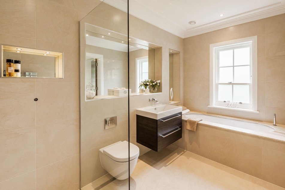 - Стиль интерьера – мебель и сантехника должны соответствовать общему стилю интерьера ванной комнаты и сочетаться с бежевыми тонами.