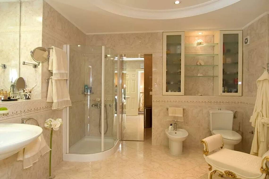 - Душевая кабина – также может быть светлой или бежевой, с матовыми или прозрачными стеклянными дверями.