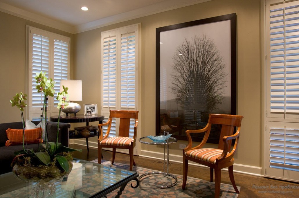 Также хорошим смягчающим эффектом для этой обстановки могу послужить кресла со светло-бежевым рисунком.
