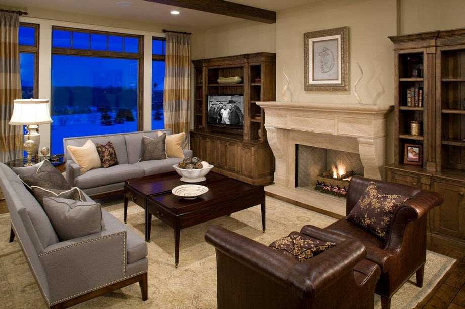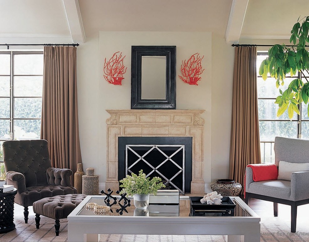 Обратите внимание на то, что в достаточно темной комнате находятся не светлые кресла, присутствие которых не делает дизайн гостиной тяжелым, так как в достаточном количестве присутствует белый цвет. В первом случае это потолок, пол и камин, а во втором портьеры, мебель и картина. Всё это способствует приятному восприятию помещения.